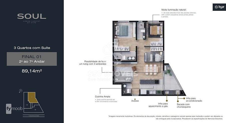 O Soul contará com plantas de 89,14m², 93,45m² e 107,48m², sendo 3 quartos com suíte e opções com garden.