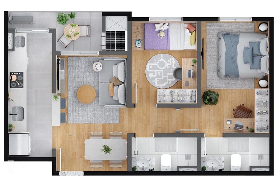 O apartamento possui unidades com 2 e 3 quartos (possibilidade de garden) que vão de 52 à 63 m² de área privativa, a unidade anunciada possui 2 quartos, 52,22 m²,