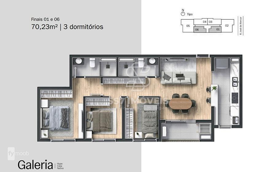 O Galeria conta com apartamentos de 70, 74, duplex com 149,01 e 127 m².