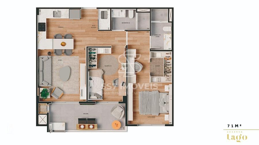 A unidade anunciada possui aproximadamente 71 m², contendo: