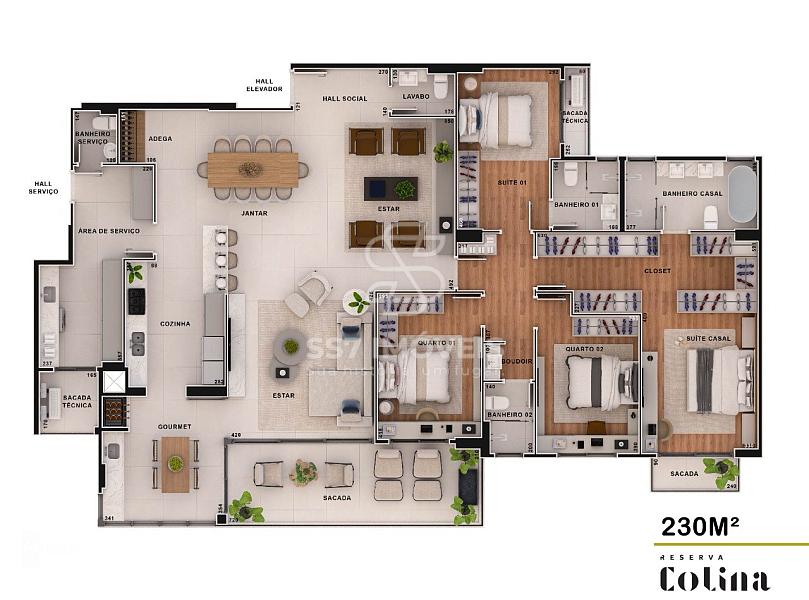 O apartamento possui 230 m² de área privativa, com a seguinte disposição