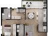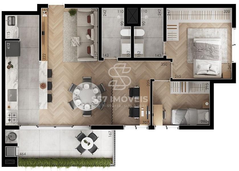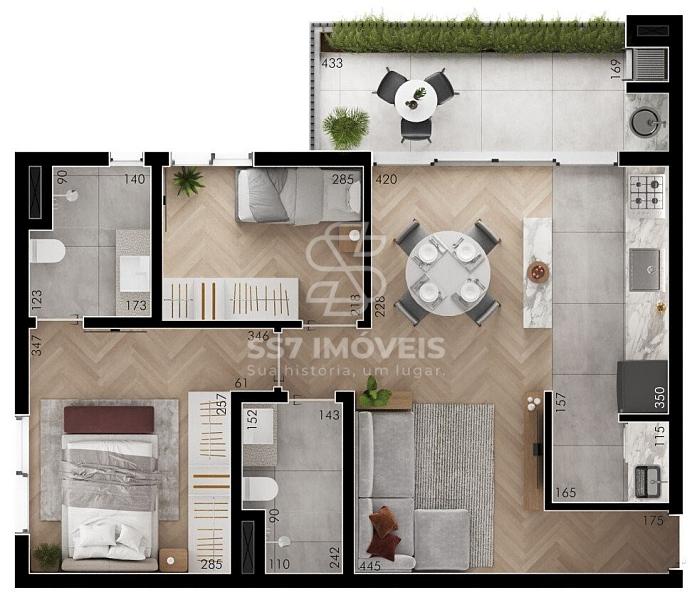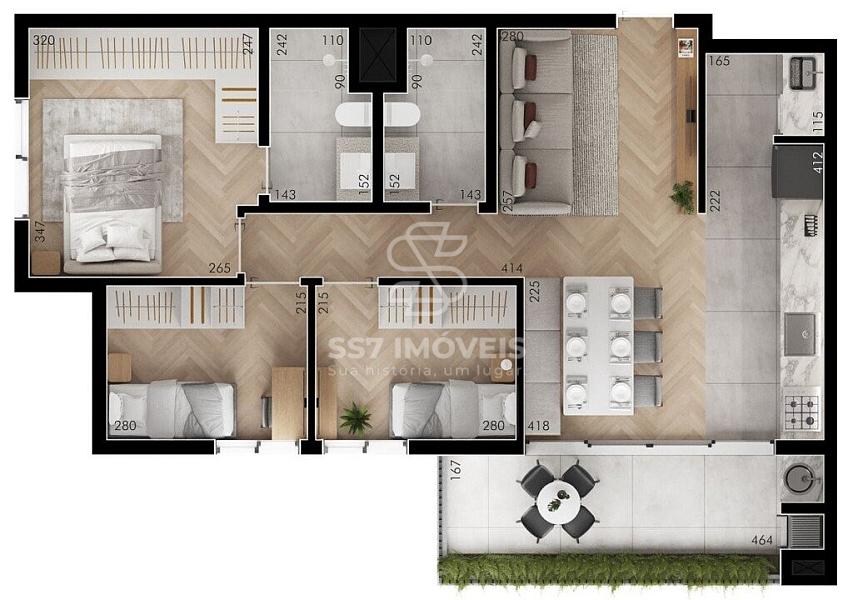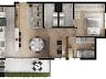 O apartamento possui 75 m² com a seguinte disposição: