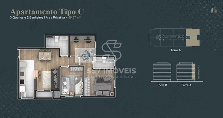 - 3 quartos com suite - 56,57m²