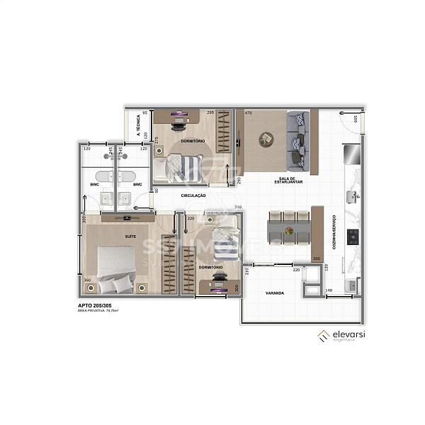 A unidade 105 tem 78,54m² de área construida mais 32,98m² de garden totalizando 111,52m² de área privativa e oferece: