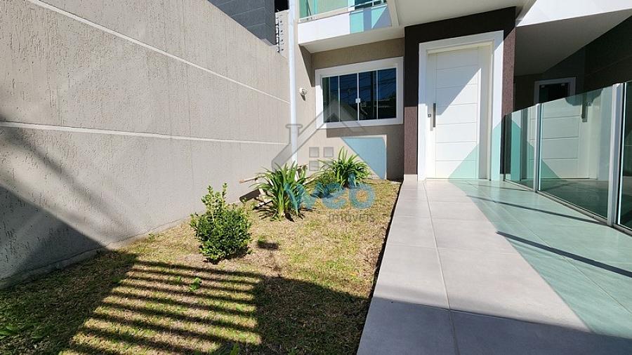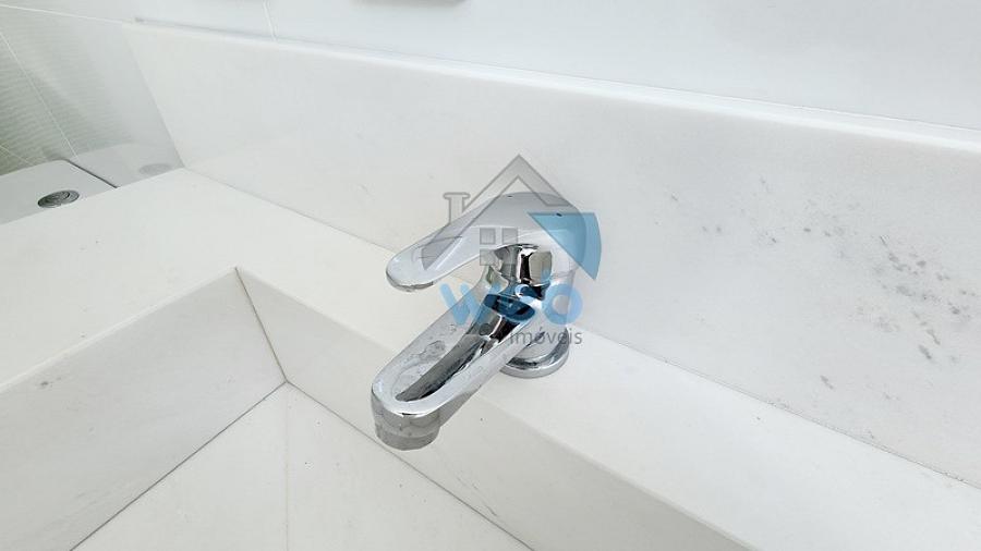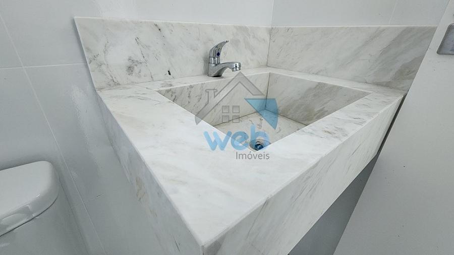 A construção possui acabamento de alto nível, com porcelanato em todas as áreas, escada em granito, teto em gesso, cozinha, banheiro e área de serviço revestidos em azulejo, grafiato na parte externa, pintura lisa branca na parte interna e pequeno jardim na entrada.
